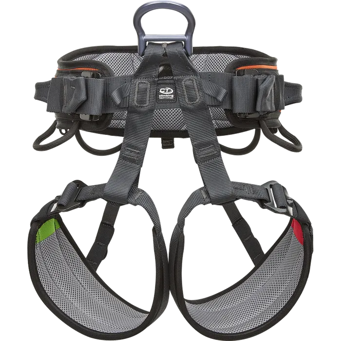 The construction is snug and lightweight with breathable mesh padding for superior comfort even during long climbs. The leg loops are designed with a directional panel construction that relieves pressure in the groin area and ensures optimal comfort during suspension. For easy matching between the corresponding sides of the waist belt and the leg loops, there are differently coloured plates - green for the right side and red for the left side - allowing for instant control.