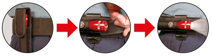 Fodral till ficklampa med roterande klipp som går att sätta i tex. bältet. Passar de flesta smala ficklampor med AA-batterier.